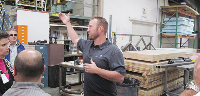 (Photo above: Sam Mieir of Composite Approach gestures while telling tour members about the company | by Steve Kadel)