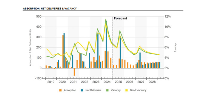 Bend continues to be a high-performing market. We are seeing a glaring issue with 482 units scheduled to be completed in 2025, which amounts to 8.2% of the overall supply in the market. As you can see in the above graph from costar, that will create a significant increase in vacancy as the supply outweighs the markets’ ability to absorb those units. Granted, many of these units are on the higher end of the spectrum. However, there will be a trickle-down effect on middle to lower-income units. Many of these higher-end buildings are offering specials to fill units, like a free month of rent, more aggressive rental pricing, and other specials.