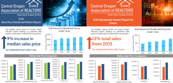 Median home price for residential homes under one acre rose 9 percent in Bend, 16 percent in Crooks County, 14 percent in Jefferson County, 6 percent in La Pine, 12 percent in Redmond, 11 percent in Sisters and 4 percent in Sunriver.