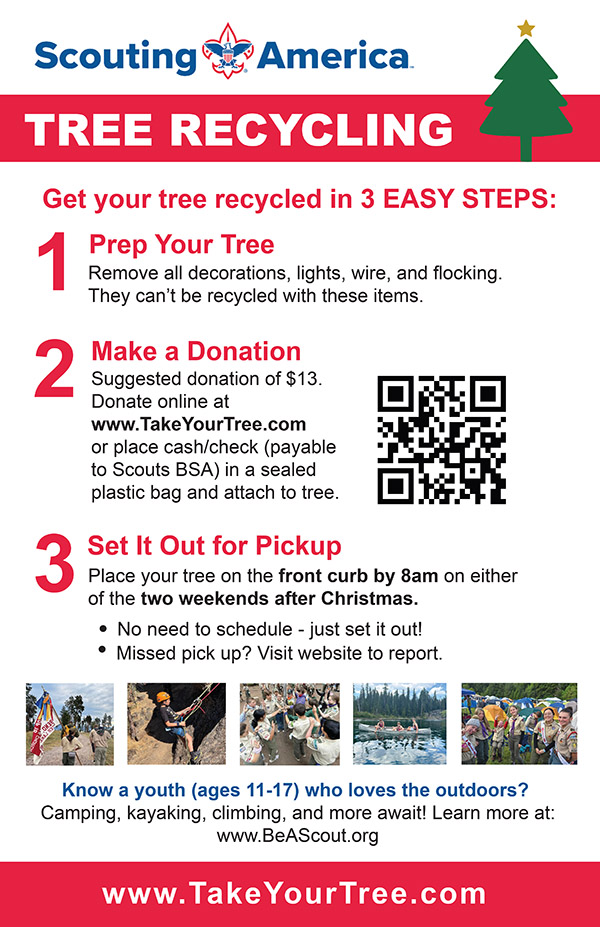 You can make a donation by visiting takeyourtree.com and clicking on the area you reside in or you can attach your donation in a Ziplock bag rubber banded to your tree. Please make your check out to ‘Scouts BSA.”