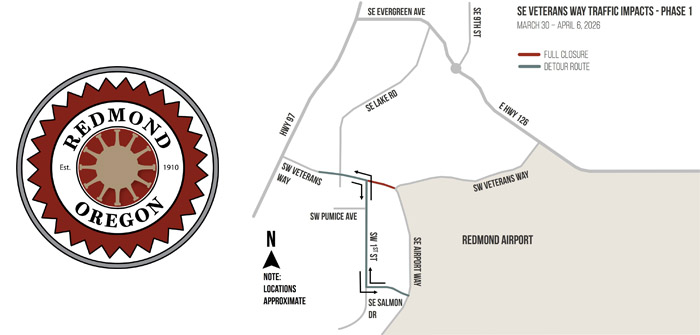 The City of Redmond will begin a multi‑phase closure of SW Veterans Way near SE First St. and SW Lake Rd. on March 30. The closure is needed to construct a new roundabout connecting SW Veterans Way, SE First St., the newly aligned SE Airport Way and its northern extension to OR 126.
