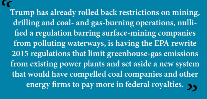 Trump has already rolled back restrictions on mining, drilling and coal- and gas-burning operations, nullified a regulation barring surface-mining companies from polluting waterways, is having the EPA rewrite 2015 regulations that limit greenhouse-gas emissions from existing power plants and set aside a new system that would have compelled coal companies and other energy firms to pay more in federal royalties. In addition he is reconsidering stricter fuel-efficiency standards for cars and light trucks, instructing the Interior Department to rewrite a rule, currently in the court, that imposes restrictions on hydraulic fracturing on federal and tribal lands and has approved two major oil pipelines, Dakota Access and Keystone XL, that Obama had halted.
