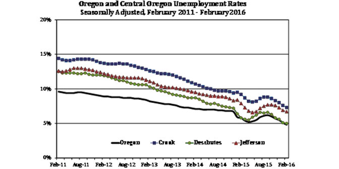 Crook County: Unemployment levels continue to improve in Crook County. The rate dropped to 7.3 percent in February from 7.6 percent in January. Improvement to the unemployment rate is likely being driven by Crook County residents finding work in Deschutes or Jefferson counties. The rate remains down significantly from last February when it was 9.2 percent.