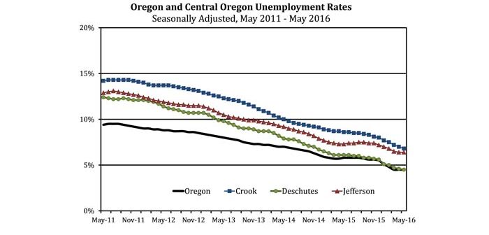 Deschutes County (Bend-Redmond MSA): The unemployment rate was essentially unchanged at 4.5 percent in May. The rate is down from last year when it was 6.1 percent.