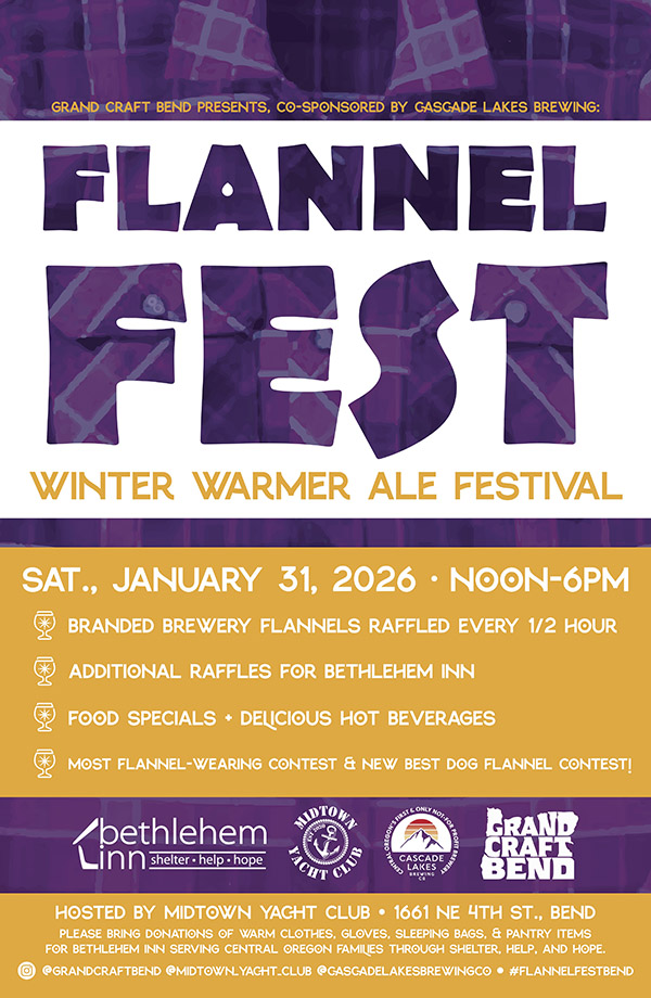 The festival, co-sponsored by not-for-profit Cascade Lakes Brewing, takes place at Midtown Yacht Club (1661 NE Fourth St., Bend) on Saturday, January 31, from 12-6pm. Tickets are not required as all beverages will be available a la carte and each beer or cider purchased gets a raffle to win brewery branded flannels (and more) every hour, with donation raffles held every half-hour with 100% of the proceeds going to the Bethlehem Inn providing shelter, help, and hope. There will also be a most-flannel-wearing contest (winner will be decided by who is wearing the most flannels concurrently). Guests are encouraged to bring cash and donations of warm clothes and pantry goods for Bethlehem Inn.
