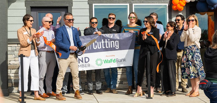 (Hayden Homes team members and leadership from the Bend Chamber of Commerce cheer as Oregon State Senator Anthony Broadman cuts the ribbon at the Parkside Place model home grand opening | Photo courtesy of Hayden Homes)