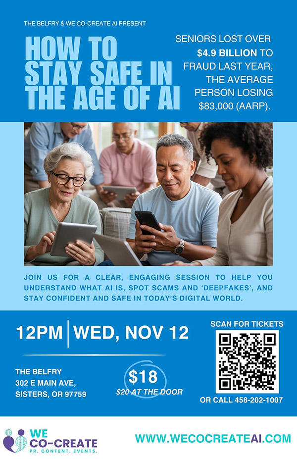 We Co-Create AI is putting on an event next month in Sisters to help protect folks in Central Oregon. The event, How to Stay Safe in the Age of AI, will bring clarity to this fast-changing topic through a friendly, informative session designed especially for Central Oregon residents 50 years old and up.