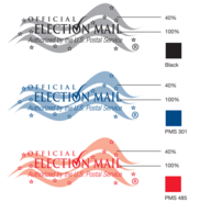 The logo design features an interpretation of the stars and stripes of the American flag, and the words “Official Election Mail,” clearly visible over the designation — “Authorized by the U.S. Postal Service.” It can only be printed in black or specific shades of blue or red.