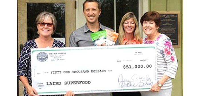 (Photo above: Paul Hodge, Co-Owner of Laird Superfood with (L-R) Sisters City Council President Nancy Connolly, EDCO Sisters Director Caprielle Lewis, Sisters City Councilor Andrea Blum | by Nicole Abbenhuis)