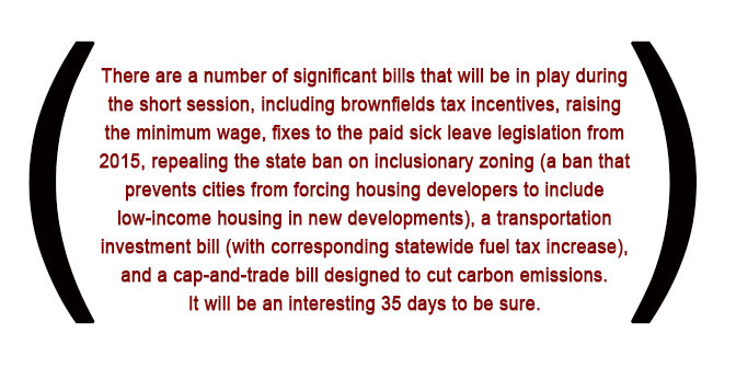 The 2016 short session started on February 1. There are a number of significant bills that will be in play during the short session, including brownfields tax incentives, raising the minimum wage, fixes to the paid sick leave legislation from 2015, repealing the state ban on inclusionary zoning (a ban that prevents cities from forcing housing developers to include low-income housing in new developments), a transportation investment bill (with corresponding statewide fuel tax increase), and a cap-and-trade bill designed to cut carbon emissions. It will be an interesting 35 days to be sure.