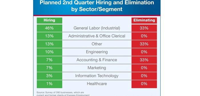 Industrial sector expects most hiring. Production and sales top list of departments Express Employment Professionals released new survey results revealing which sectors and departments are planning to do the most hiring in the second quarter of 2016.