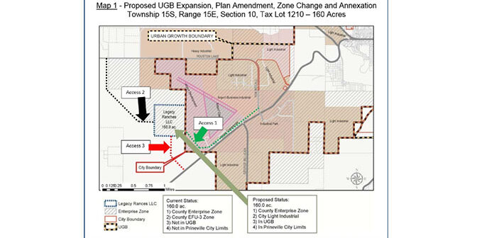 Legacy Ranches, LLC submitted a request to the City of Prinevillein November seeking an amendment to the Urban Growth Boundary (UGB) to include 160 of the 1,424 acres the company owns near the Prineville Airport. The land was purchased in January 2015.