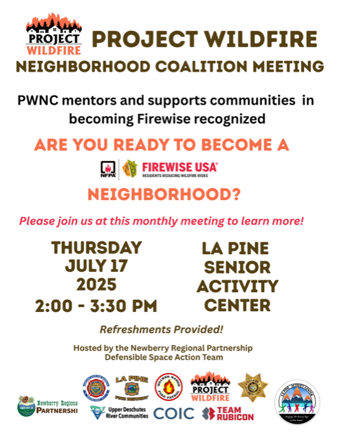 You are invited to attend Deschutes County’s Project Wildfire Neighborhood Coalition (PWNC) July meeting in La Pine! As a subcommittee of Project Wildfire, the Coalition aims to prevent deaths, injuries, property loss and environmental damage resulting from wildfires in Deschutes County — by improving fire-adapted readiness one neighborhood at a time. The Coalition will bring Firewise Coordinators together to support one another and accelerate the adoption of fire-readiness throughout Deschutes County.