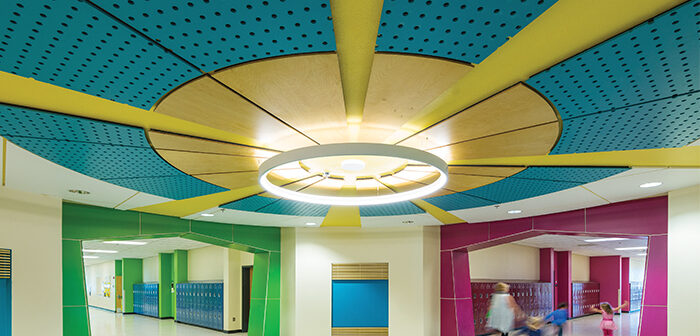 BLRB’s Senior Interior Designer Mindy Lyman said creative features such as crafted clouds and circles helped reduce the scale of the more cavernous traditional school building, while tasteful acoustical fixtures toned down volumes.
